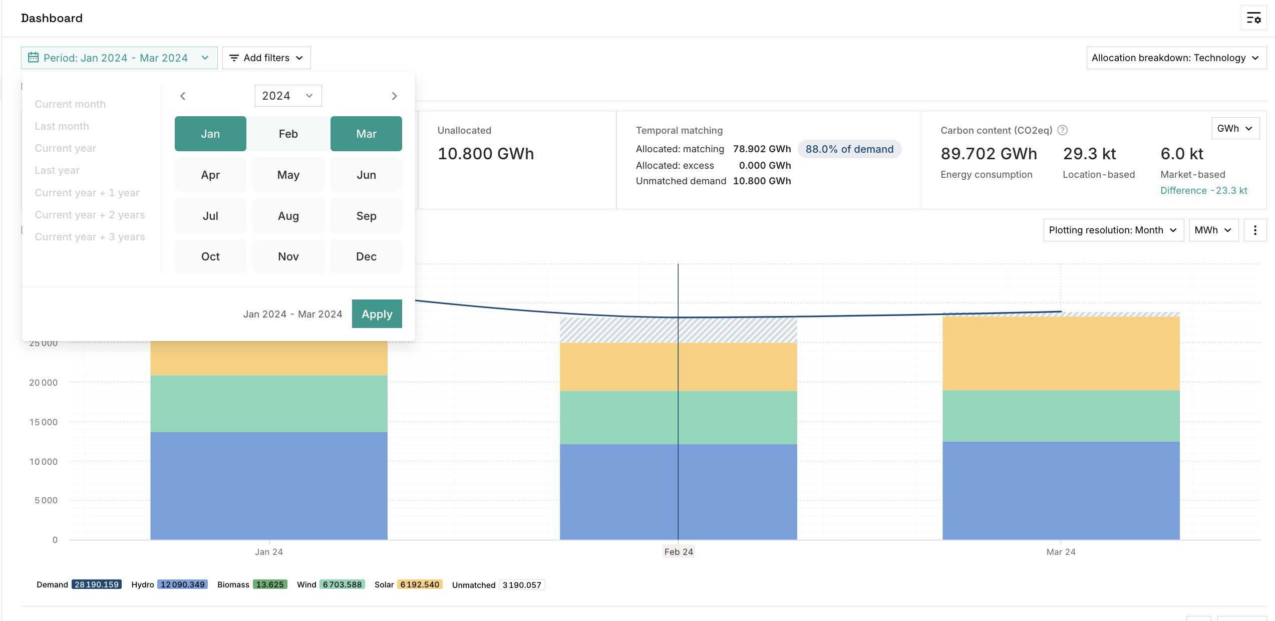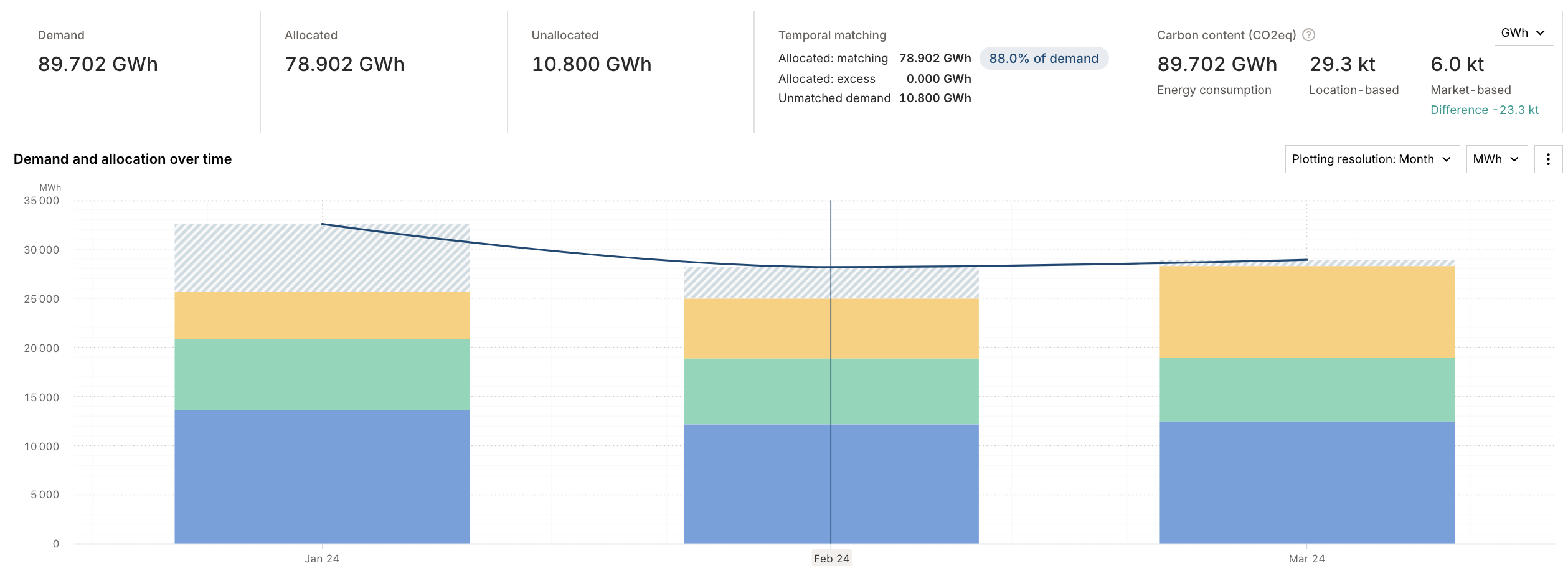 ℹ️ Good to know: Your matching percentage will typically look higher on a monthly view than on an hourly one. This is completely normal — it simply reflects that renewable energy isn't always generated at the exact hour you're consuming it. The hourly view gives you the most accurate picture of true granular matching.