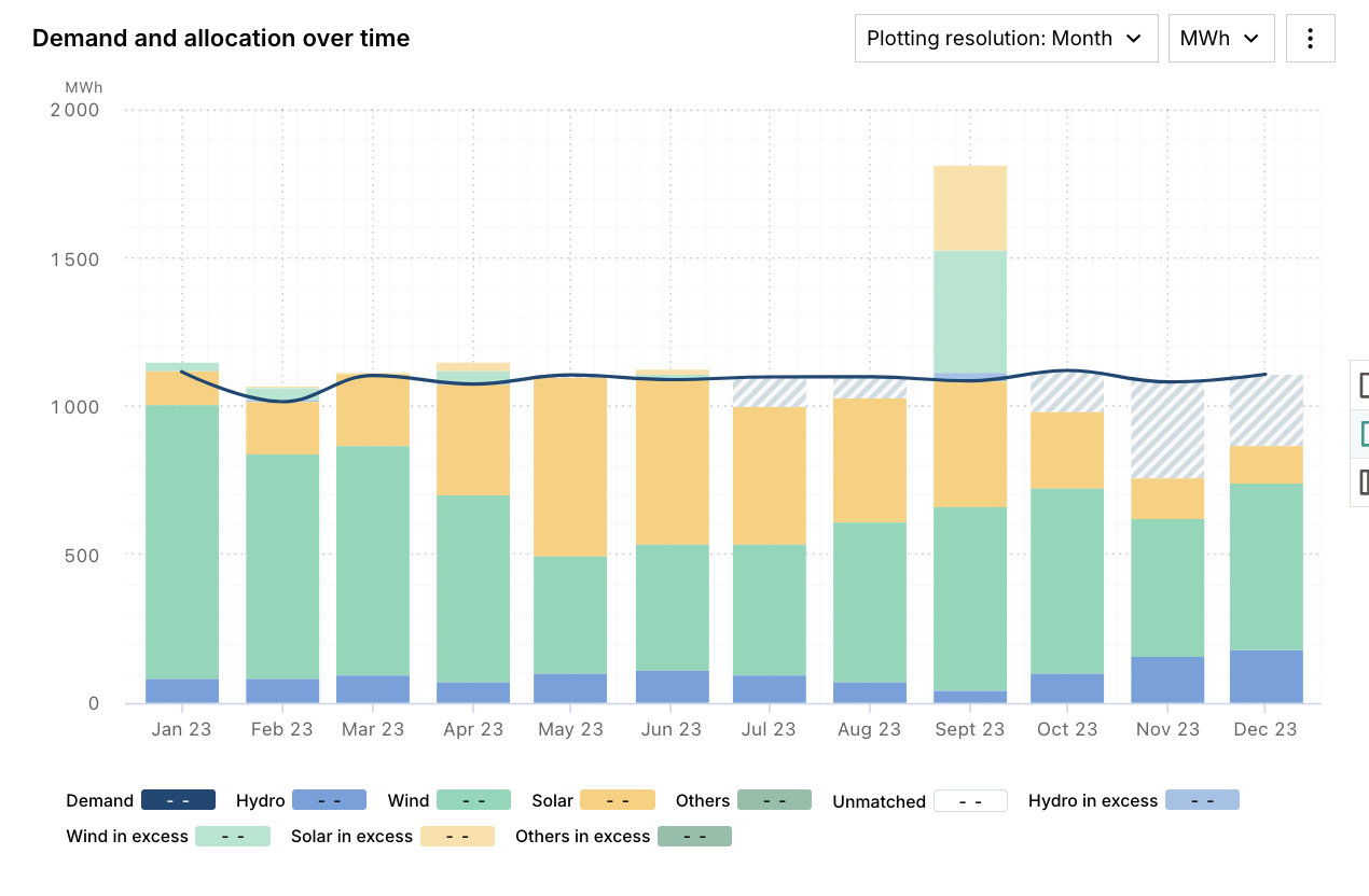 Example: You're preparing your annual sustainability report and want to understand your renewable matching in detail. Start with the monthly view for the big picture, then switch to hourly to see how your consumption and renewable supply align throughout the day.