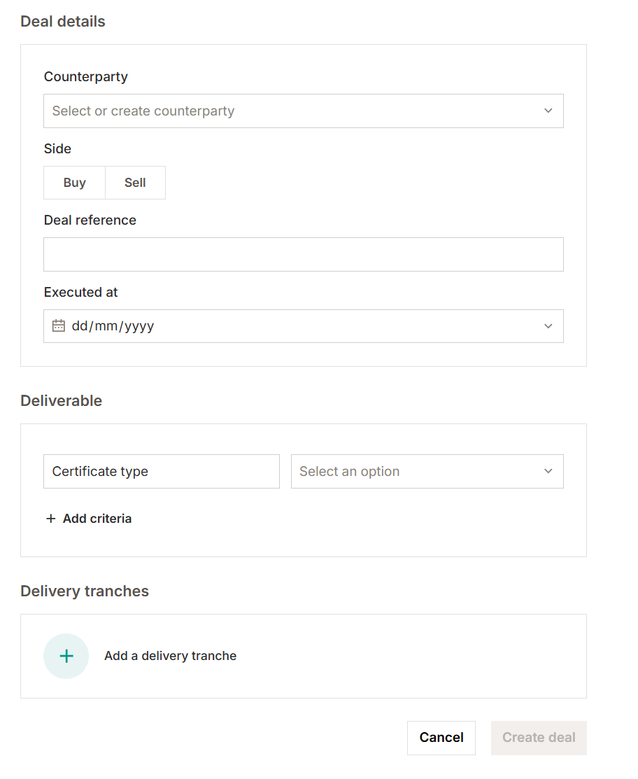- Certificate quality and details matter: the qualities you specify on a tranche (technology, geography, vintage, labels) determine which inventory certificates can be matched to it during reconciliation. Make sure they reflect what's in your contract.