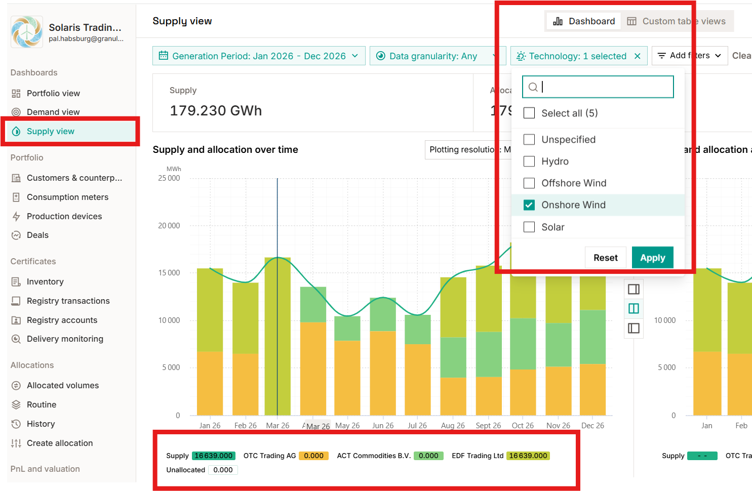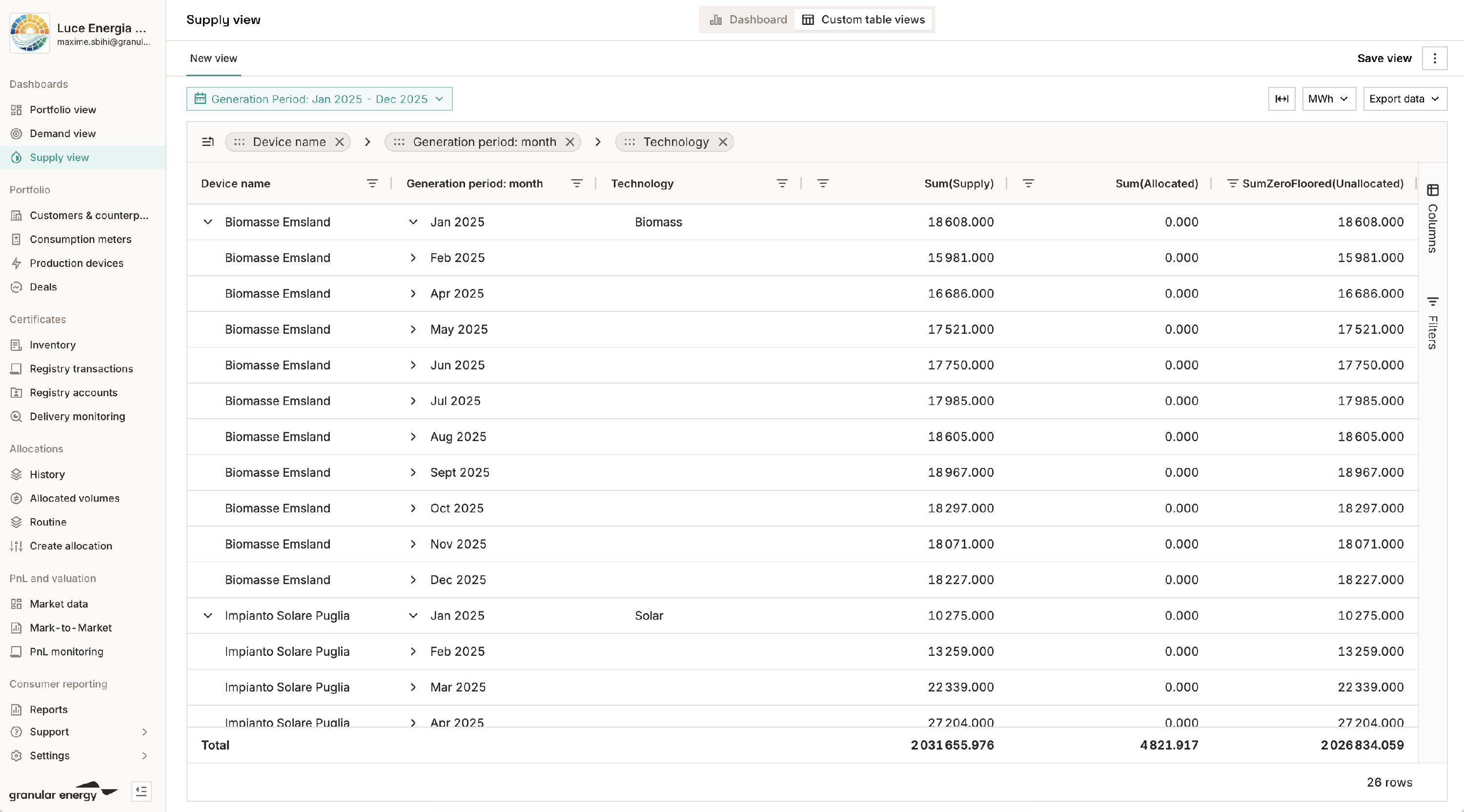 What you'll see: The supply side of your portfolio - this includes owned assets, PPAs, and other market purchases. Here you can see current inventory that has already been delivered, such as expected or contracted inventory (e.g. buy deals that will be delivered in the future). You can also see any allocations made from the generation. Use the grouping and filtering options to break down allocation coverage by device, technology, country, or other dimensions.