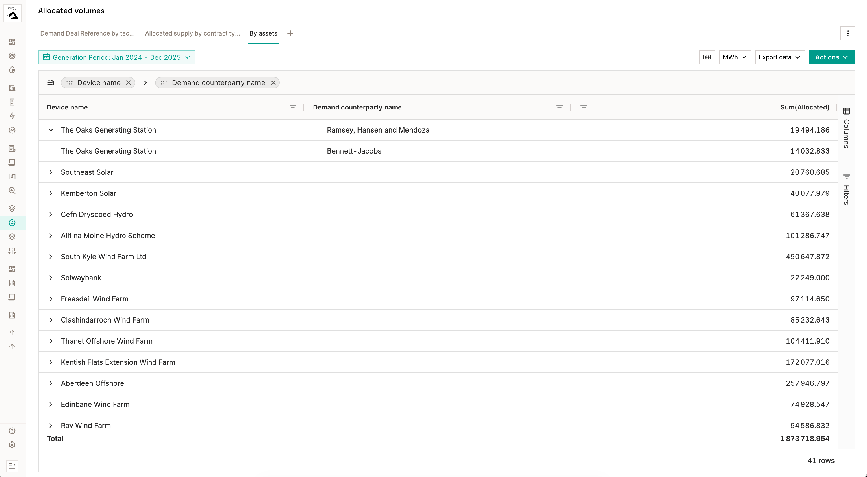 What you'll see: A detailed, filterable view of all allocated volumes, showing exactly which supply volumes were matched to which demand, with full attribute detail. You can also use this to view allocation outcomes by other attributes in the demand portfolio. One example would be viewing asset allocated volumes for all customers enrolled in the same tariff, which can be further drilled down to the specific customer level.