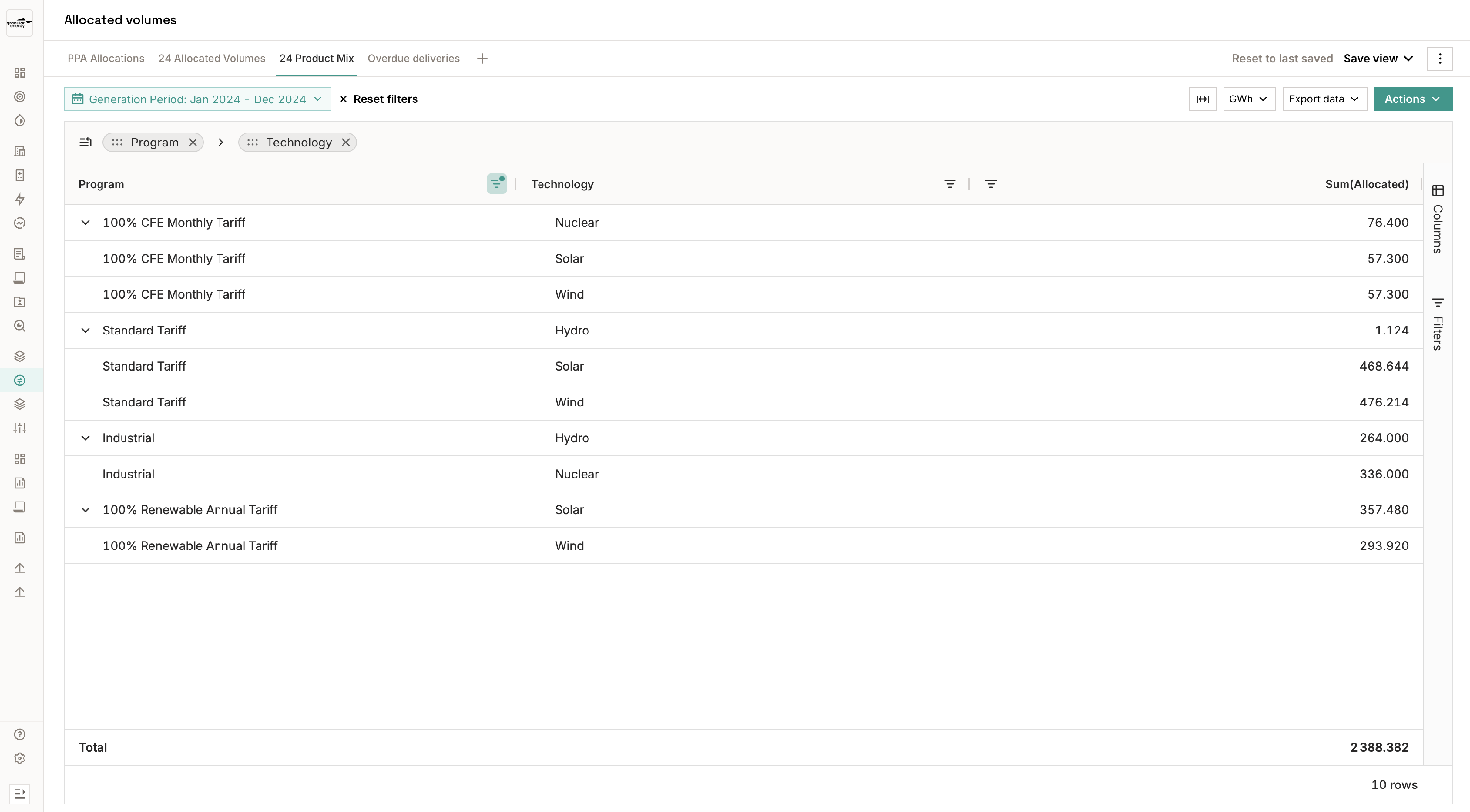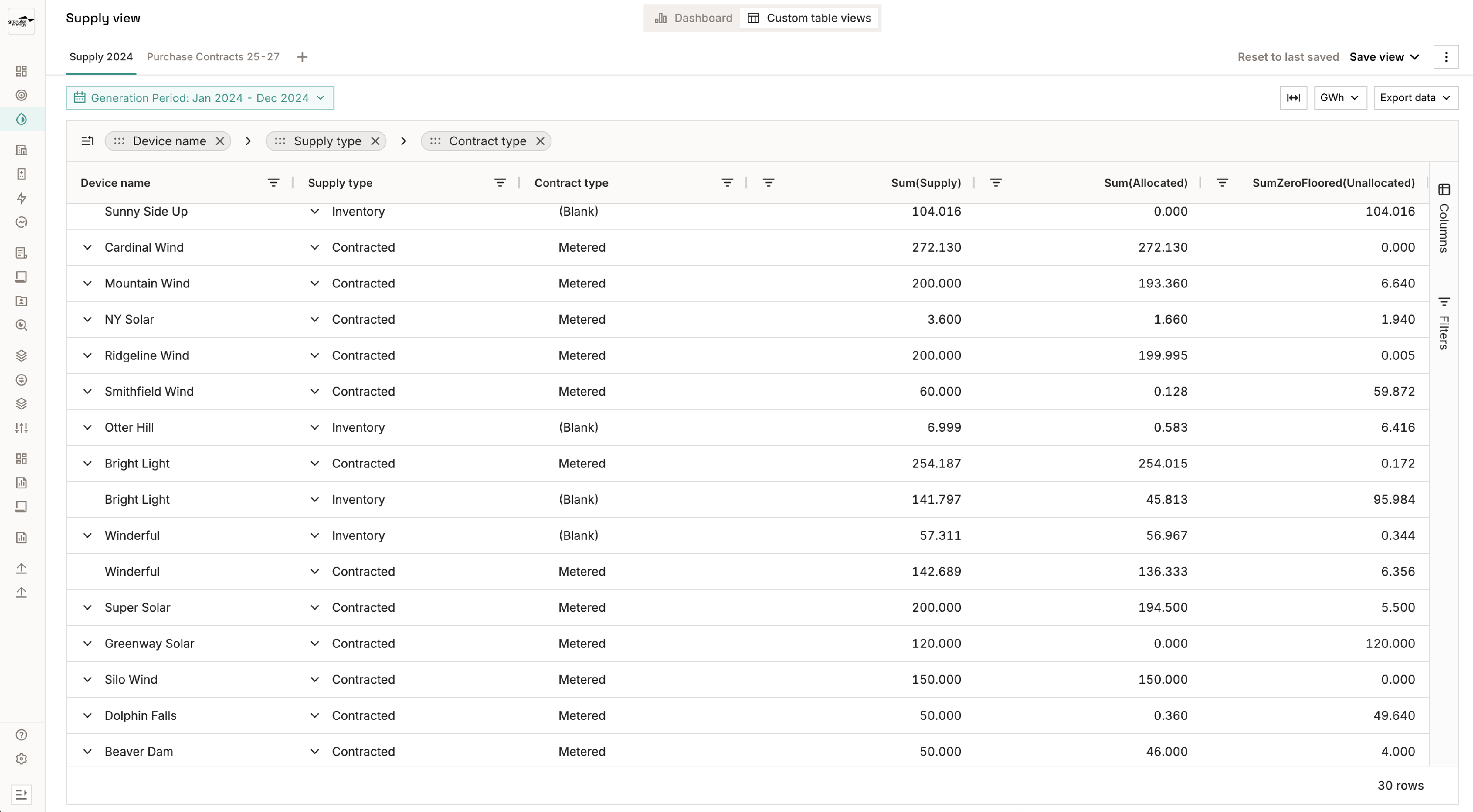 - Group by production device or supply type to see how each source has been allocated.