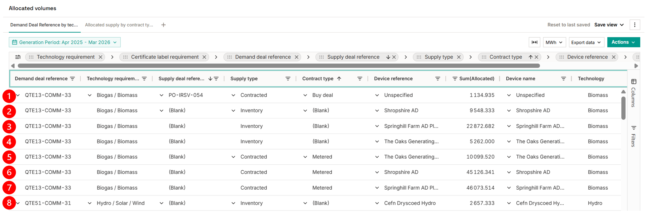 - #1 is an allocation from a future buy deal that has not yet been delivered. This can be deduced from the Supply type (Contracted) and the Contract type (Buy deal). In the Technology column we can see that the buy deal is restricted to Biomass, so we already know the technology. However, as the concrete EACs have not yet been delivered, we do not know which asset the EAC comes from (Device reference → Unspecified)