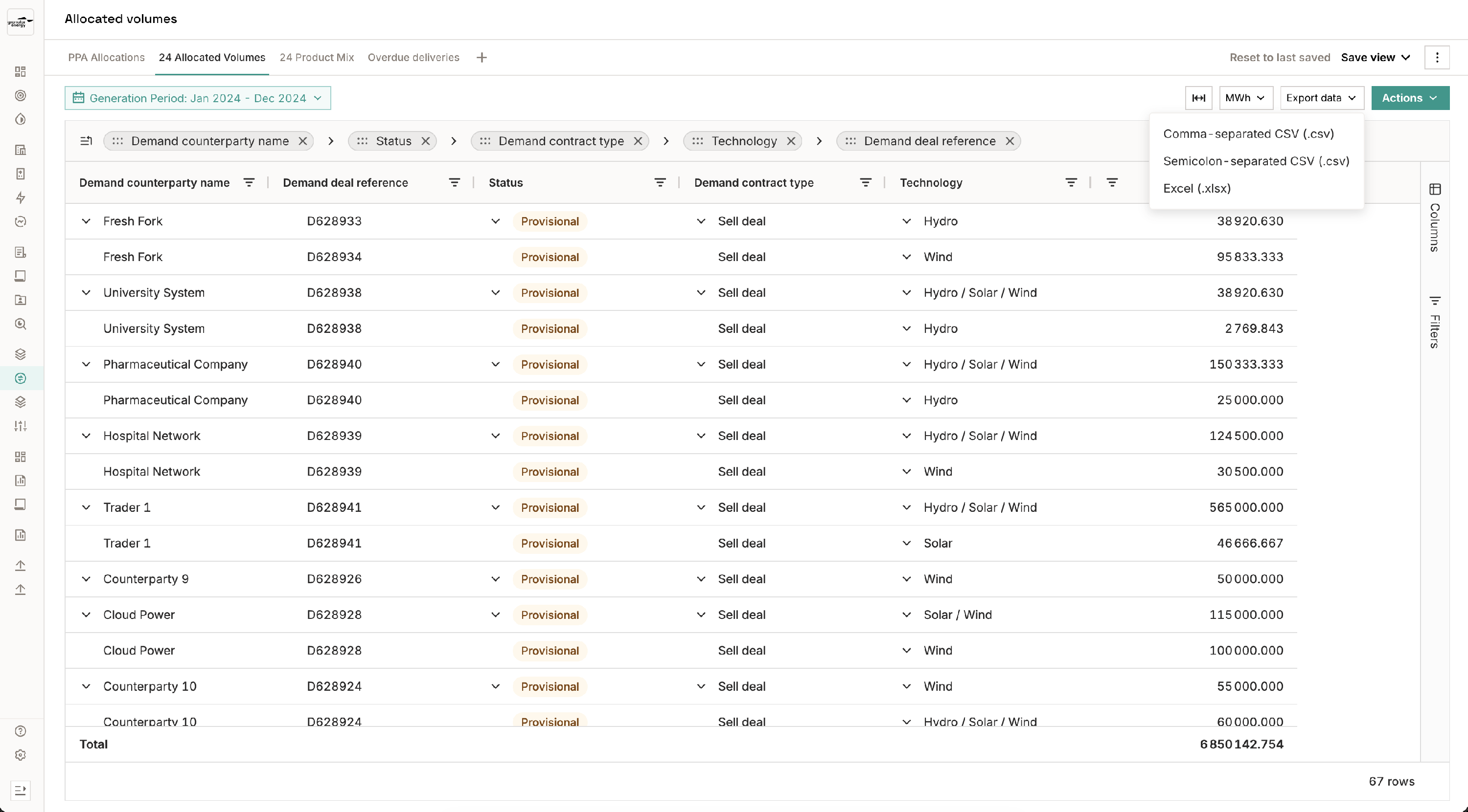 - Export for audit — the Allocated Volumes view can be exported to XLSX/CSV at any time, providing a record of how supply was mapped to demand.