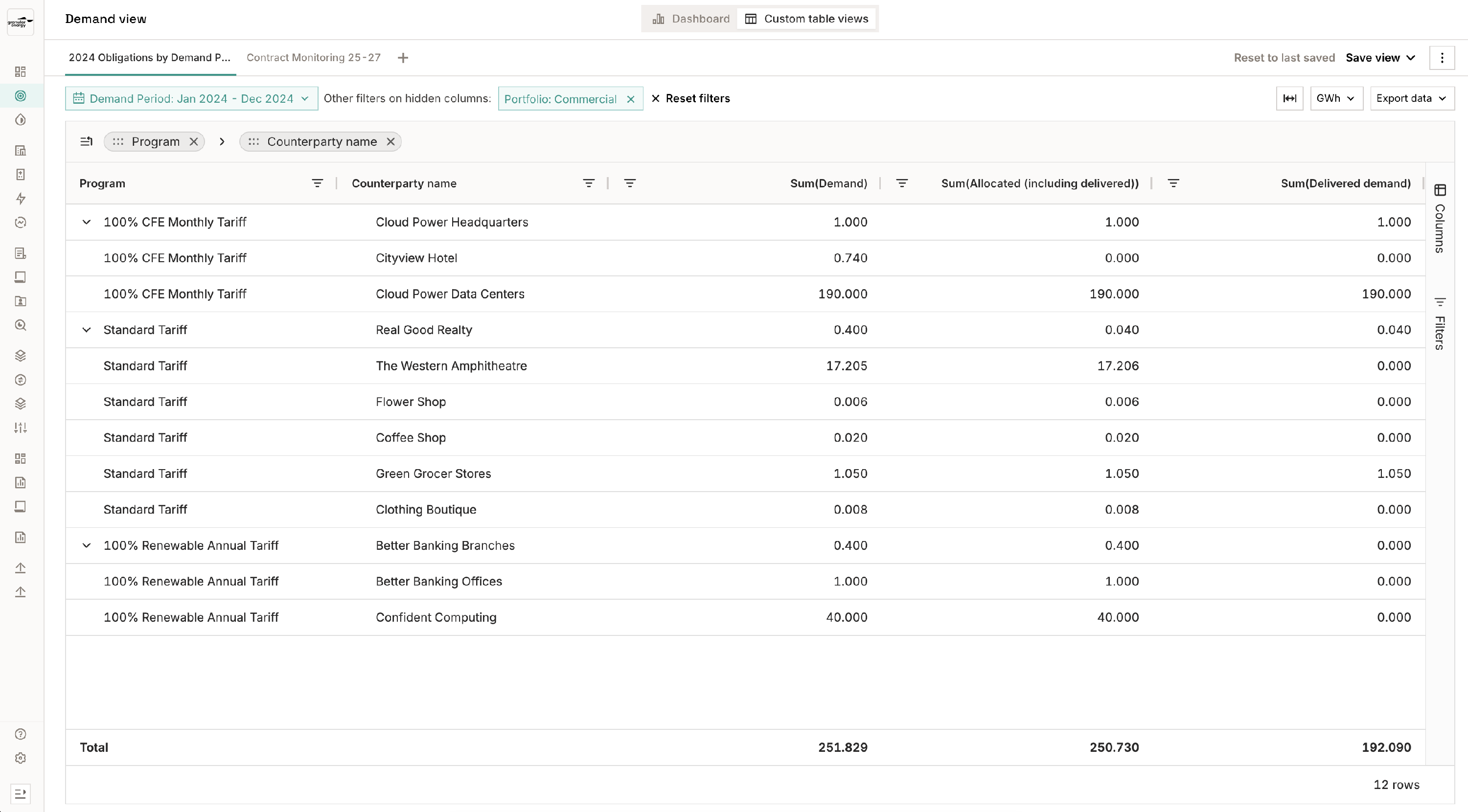 The Demand view lets you check whether each customer's consumption or sell deals have been covered by allocations in terms of total volumes.