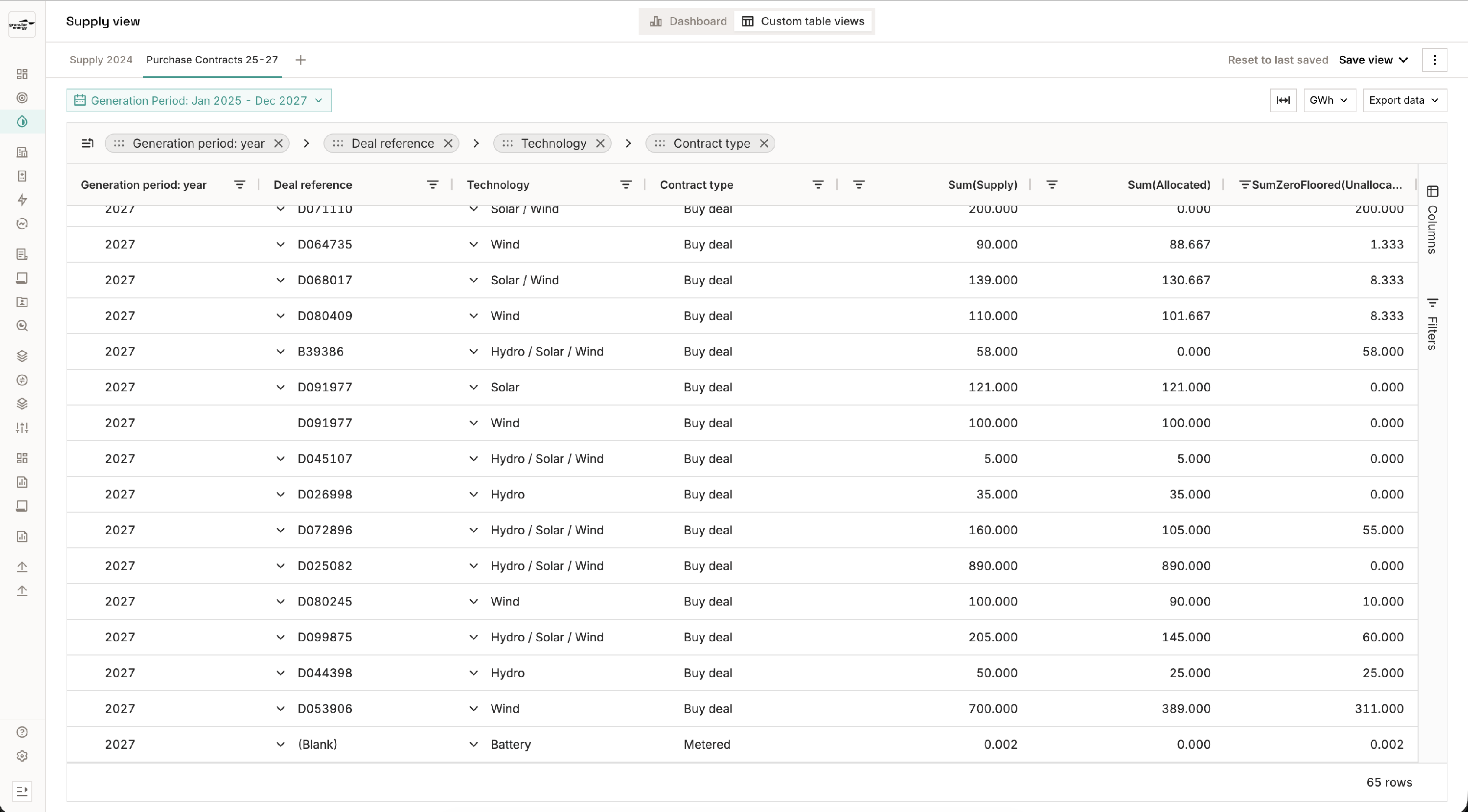 - #5–#7 are allocations from a PPA, as can be seen from the Contract type → Metered. The Supply type is Contracted (as opposed to Inventory), implying that the delivery of GOs has not happened yet. We don't know how many GOs will exactly be delivered in the end; the current volume is based on the latest forecast. (If you want to read more on how Granular Energy deals with updating forecasts, you can read the articles Monitor your supply portfolio over time and Monitor your demand portfolio over time)