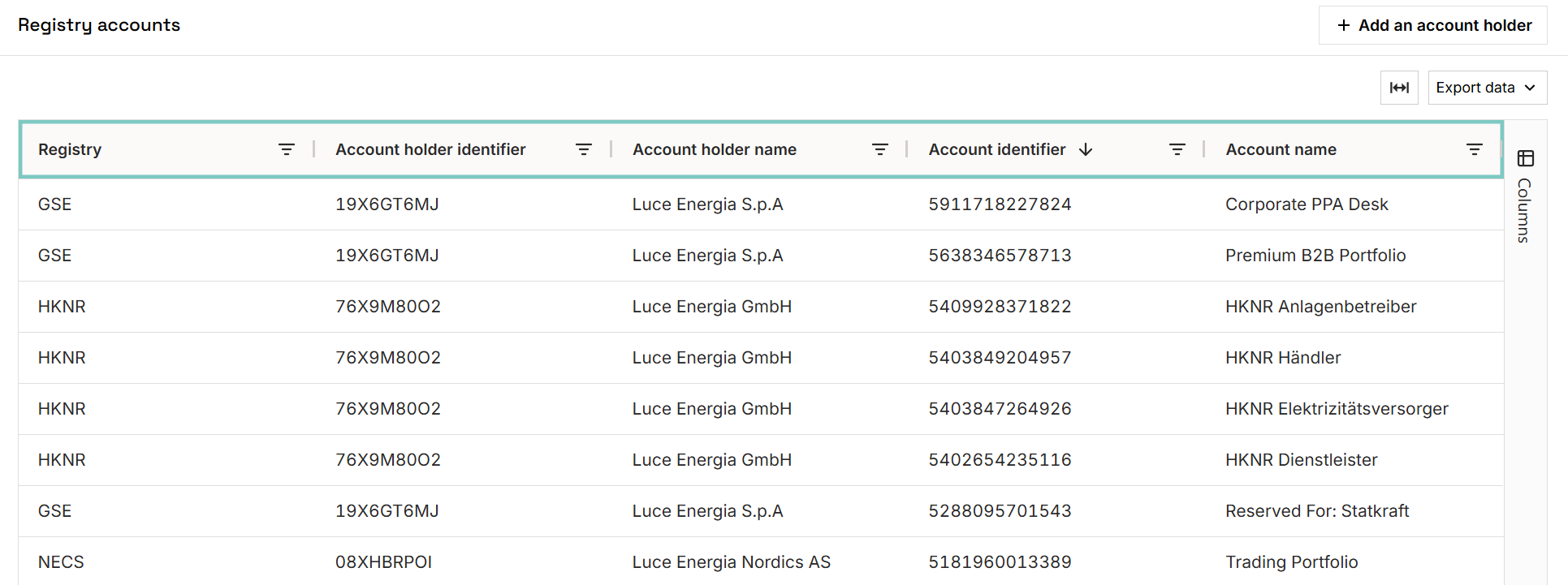 This page lists all the accounts your organisation holds across external registries. Each row represents a registry account, showing: