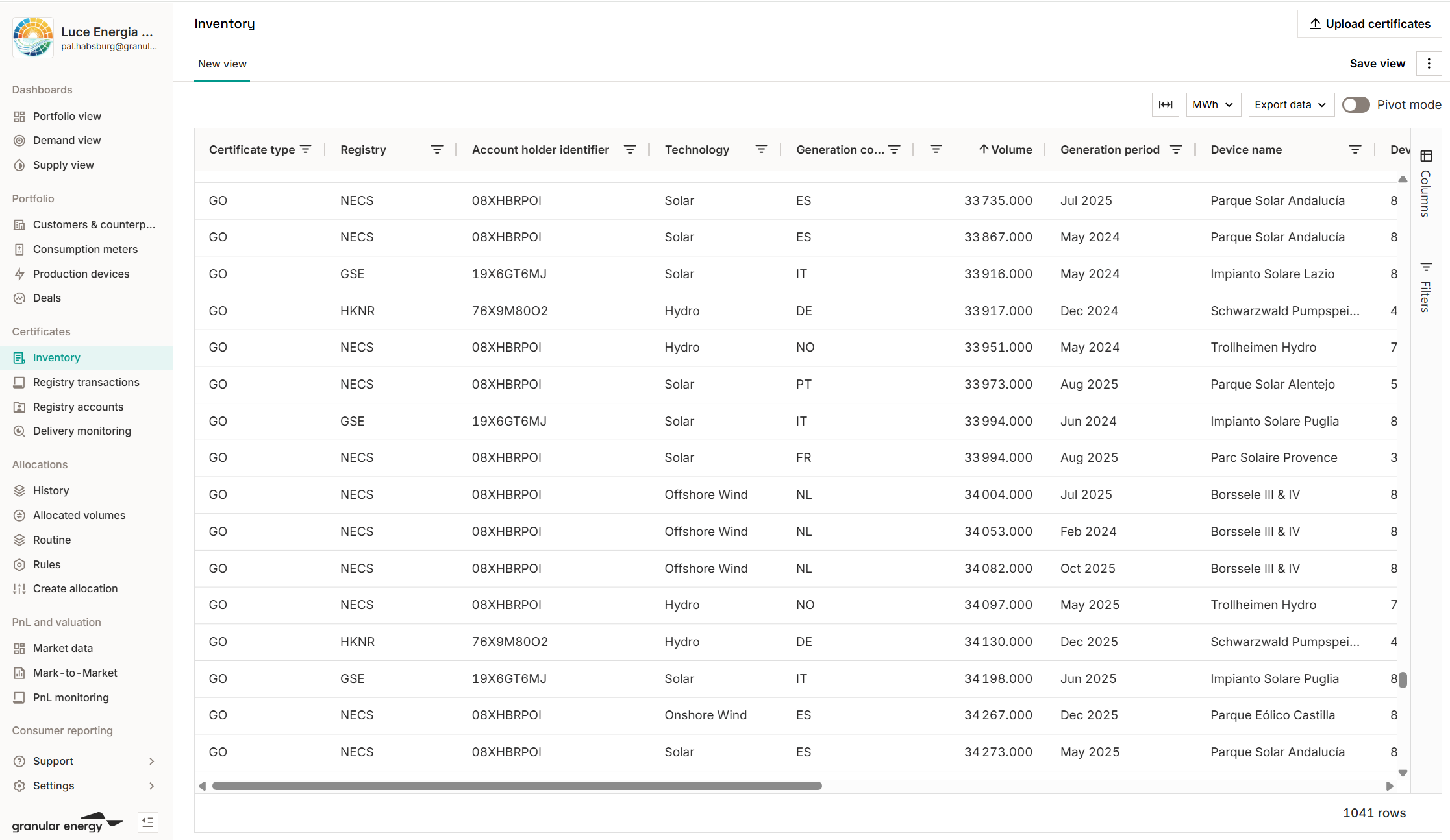 - Inventory — see your aggregated holdings across all accounts and registries, with filtering by registry, certificate type, country, technology, and other attributes