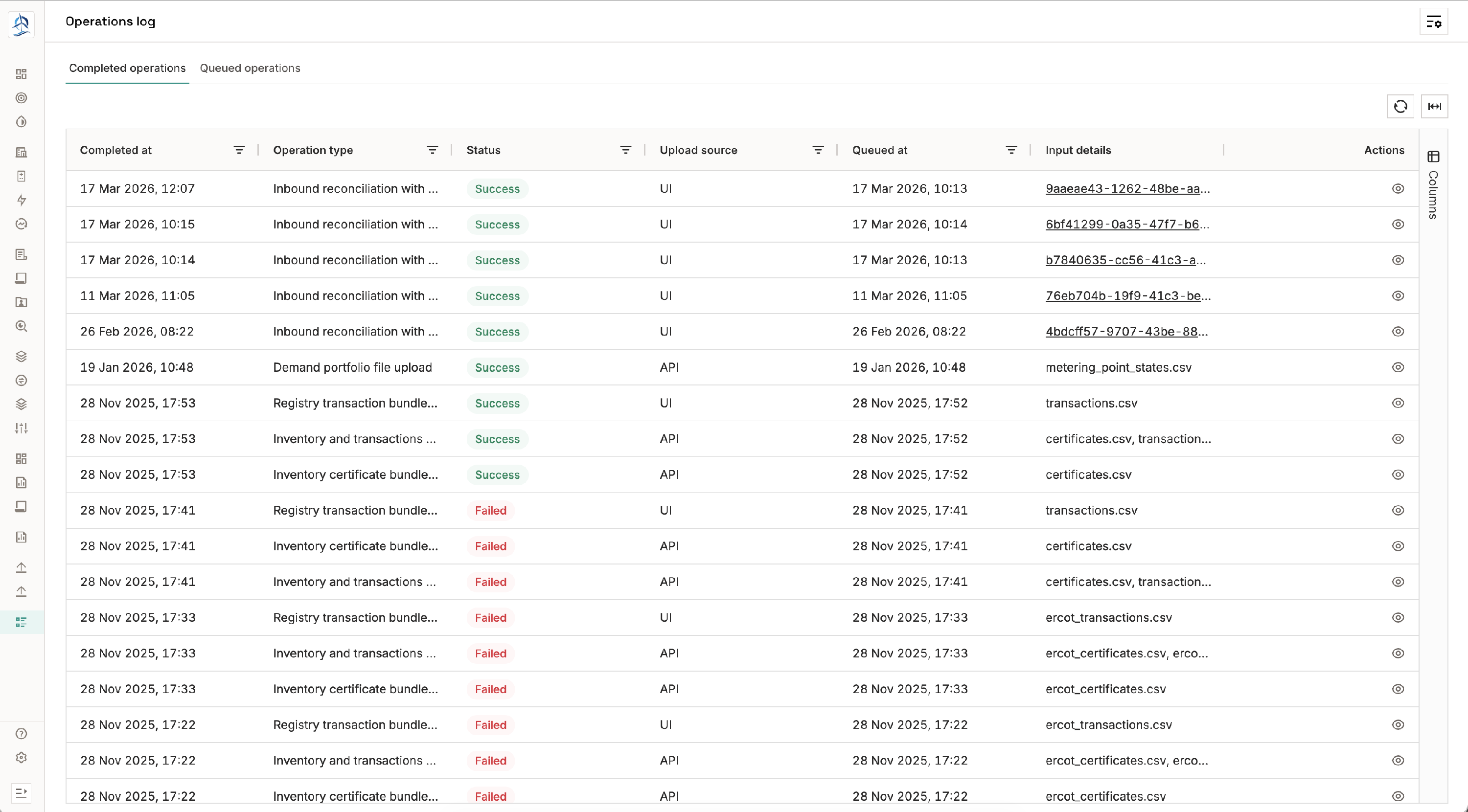 For a more detailed view, there is a dedicated full-page operations log with filters. This is useful if you need to review the history of operations, investigate a failure, or check the status of an operation that was triggered a while ago. For completed operations, you can expand the details to see the specific error
