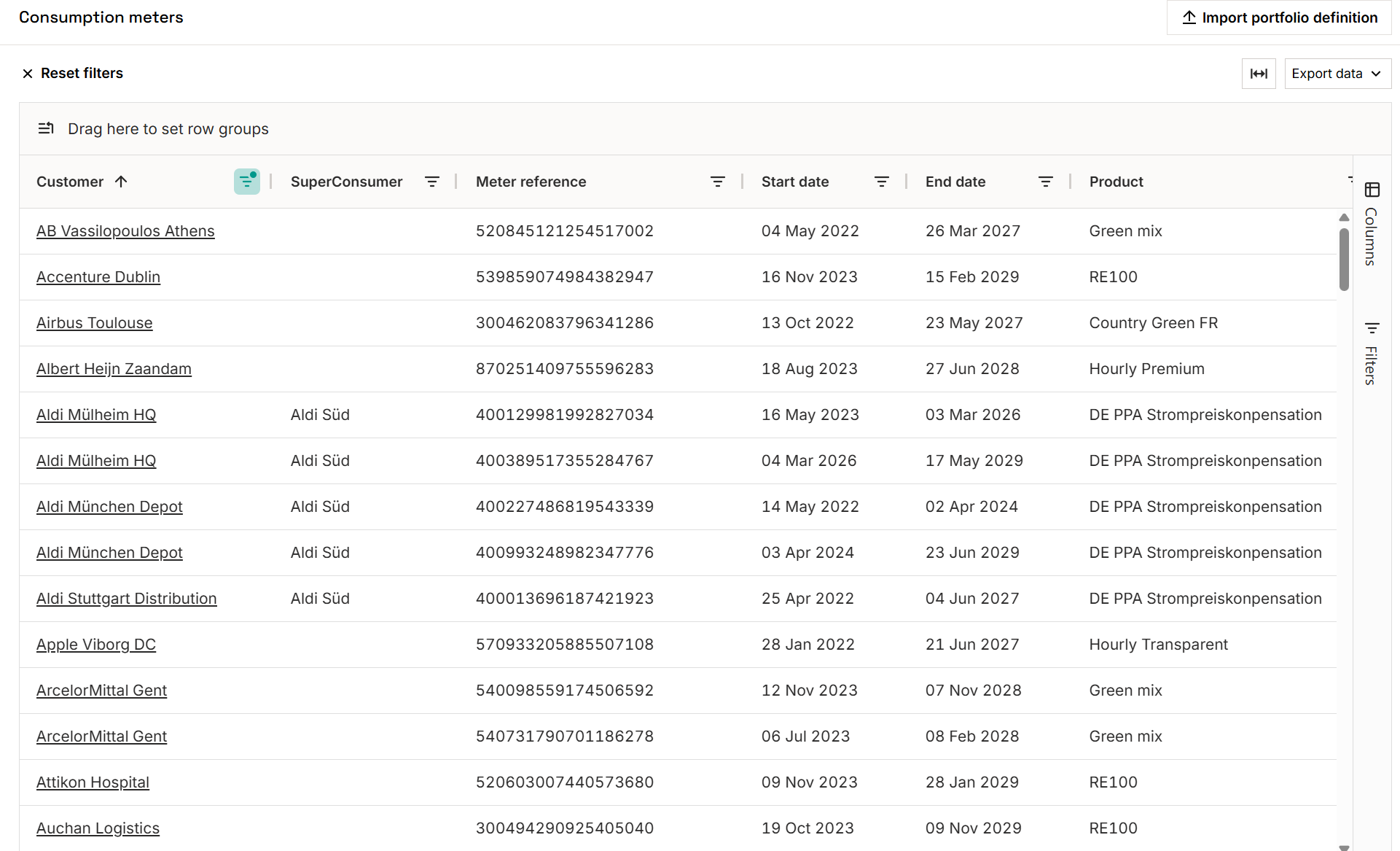 The demand portfolio is built around two concepts: customers (or counterparties — the entities you are delivering EACs to on behalf of) and consumption meters (the metering points associated with each customer). Together, they tell the platform which customer should receive what type of EACs, and for how long.